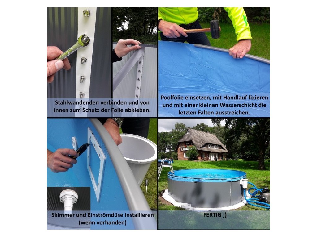 Bazén se instaluje pomocí spodních a horních lišt, do kterých se zasazuje ocelová stěna. Oba kraje stěny se propojí pomocí vnitřních a vnějších lišt a šroubů. Mrazuvzdorná folie se pomocí zalomení o horní část ocelové stěny zavěsí a vytvaruje do bazénu dle vizuálních požadavků. Folie je flexibilní a na míru vyrobena pro tento typ bazénu (není třeba žádných úprav). Pro montáž krok za krokem následujte pokyny v montážním návodu.