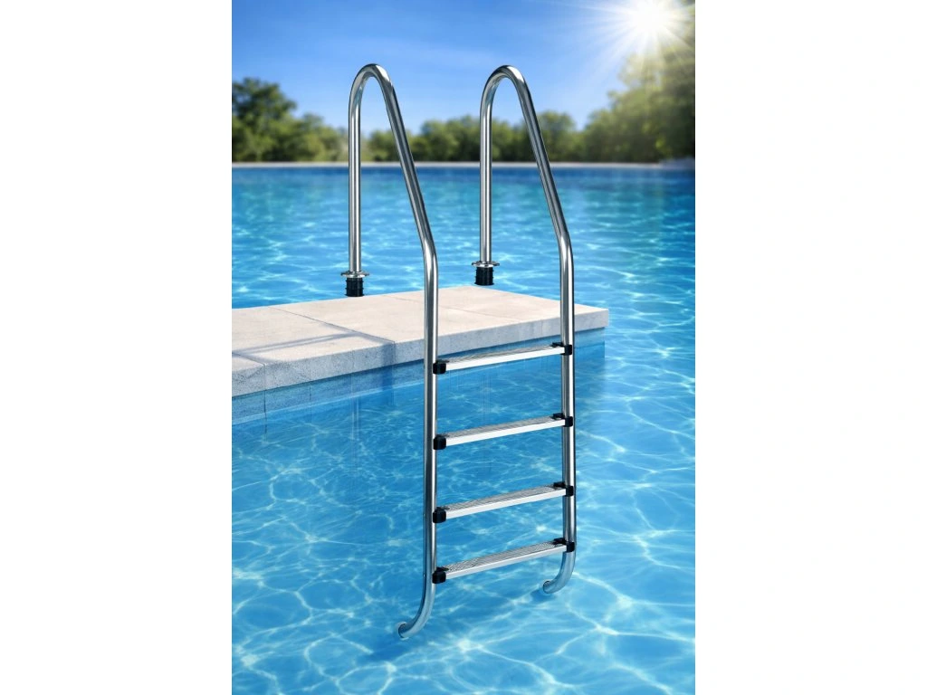 Schůdky jsou vyrobeny z odolné nerezové oceli, která zajišťuje dlouhou životnost a vysokou odolnost vůči vlhkosti i bazénové chemii. Protiskluzové plastové stupně a gumové koncovky zvyšují bezpečnost při vstupu a zároveň chrání bazénovou fólii nebo povrch bazénu před poškozením.