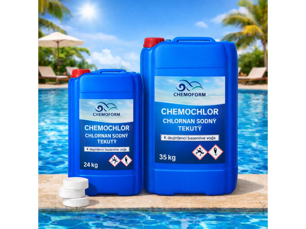 Chemochlor je tekutý dezinfekční přípravek na bázi chlornanu sodného, určený pro účinnou a rychlou dezinfekci bazénové vody.