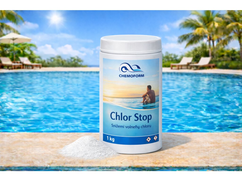 Chlor Stop je speciální granulovaný přípravek pro snížení nadměrného množství chloru v bazénové vodě.