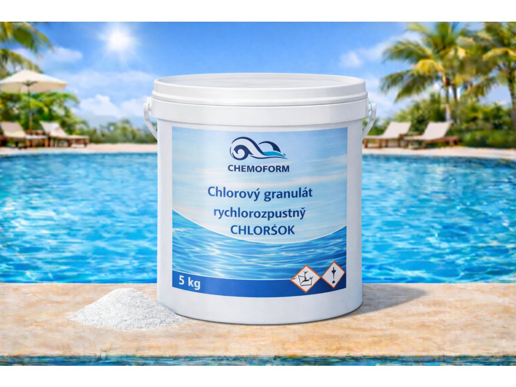 Chlorový granulát rychlorozpustný CHLORŠOK je vysoce účinný přípravek určený pro šokovou dezinfekci bazénové vody.