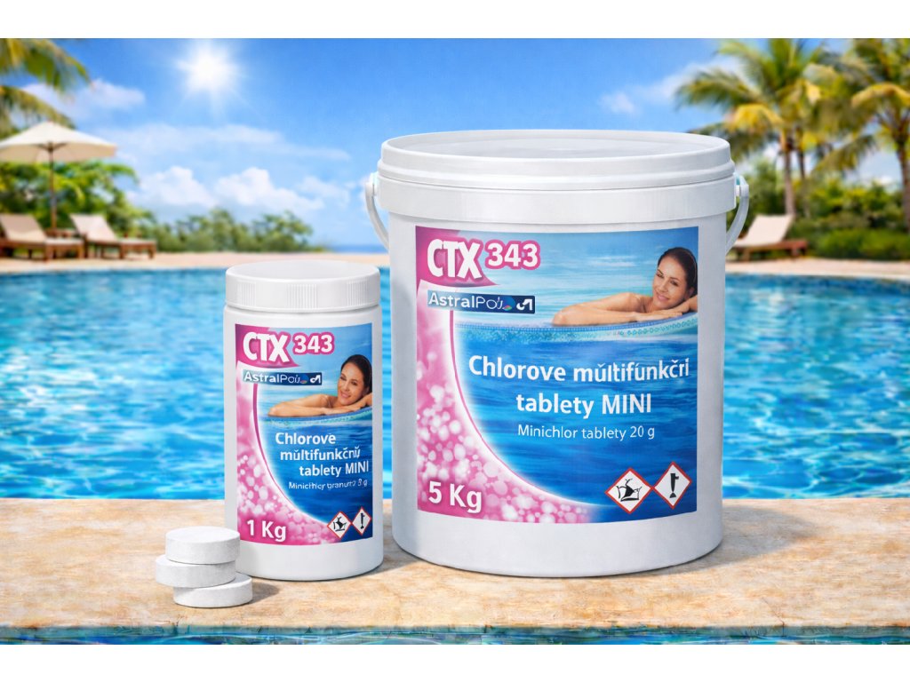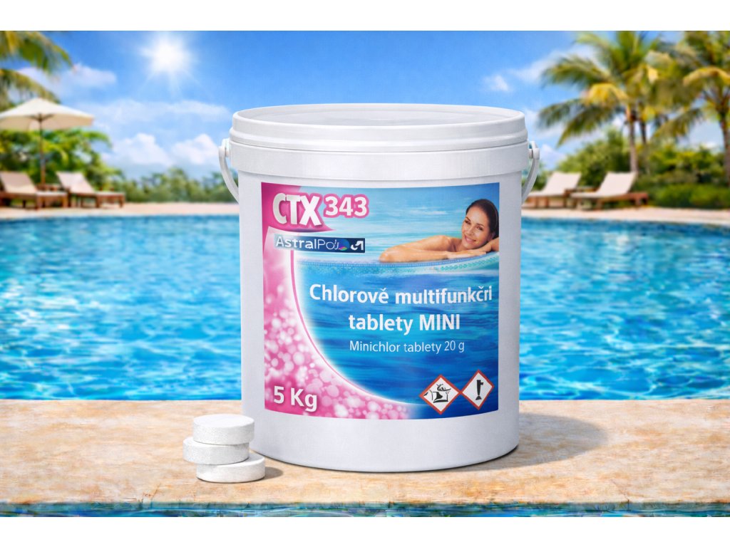 CTX 343 jsou multifunkční chlorové tablety MINI určené pro komplexní úpravu a dezinfekci bazénové vody.