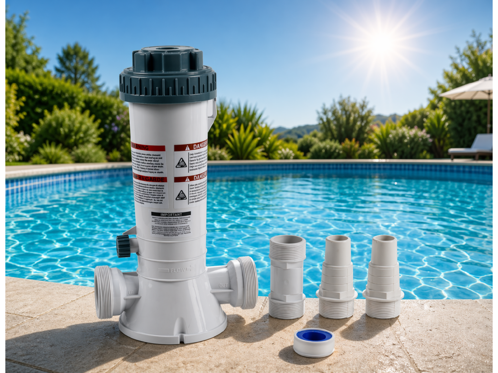 Poloautomatický dávkovač chlóru (cca 1,8 kg) je zařízení určené pro průběžné dávkování chlorových tablet do bazénové vody. Zajišťuje stabilní hladinu dezinfekce bez nutnosti každodenního ručního dávkování.