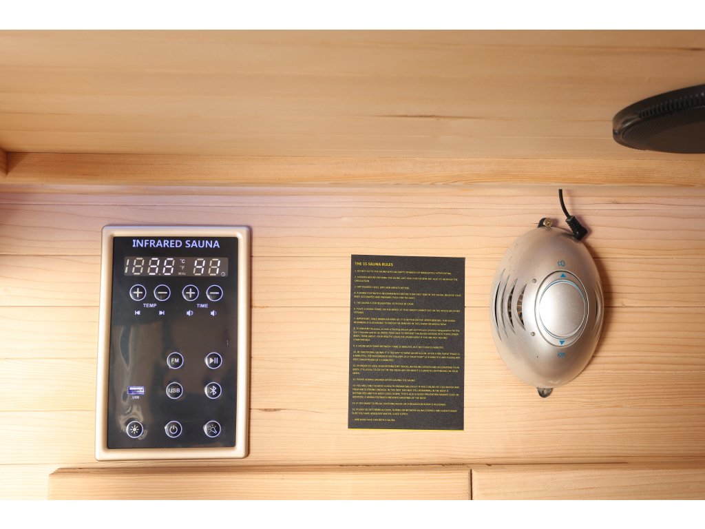 - Pro regulaci správné teploty uvnitř sauny-infrasauny můžete použít přenosný stropní ventilátor. Toto umožní rychlejší a rovnoměrnější rozložení tepla.