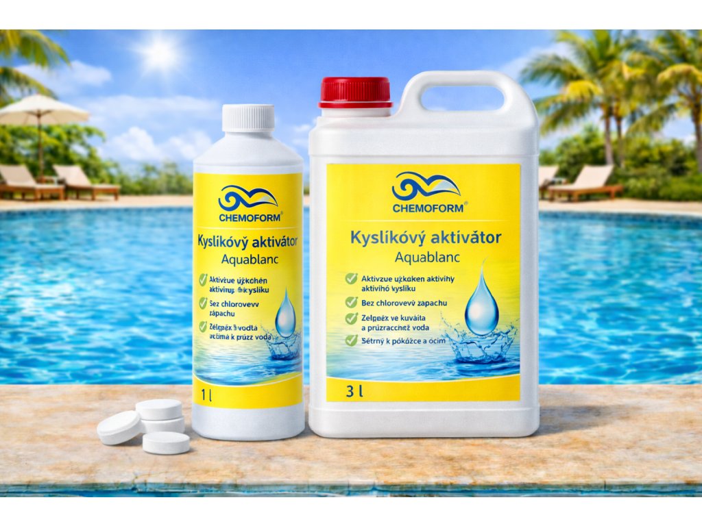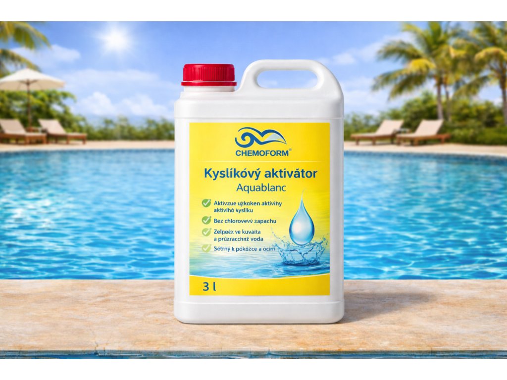 Kyslíkový aktivátor Aquablanc od společnosti Chemoform je speciální přípravek určený pro aktivaci a zesílení účinku dezinfekce na bázi aktivního kyslíku v bazénové vodě.