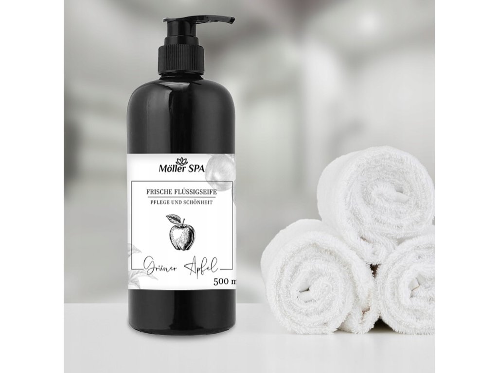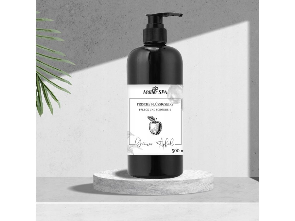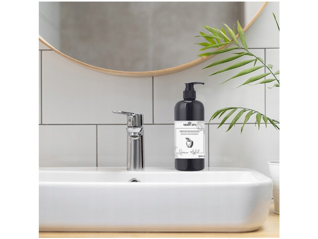 Tekuté mýdlo Möller SPA s vůní zeleného jablka pomáhá neutralizovat nepříjemné pachy přetrvávající na rukou po přípravě jídla.