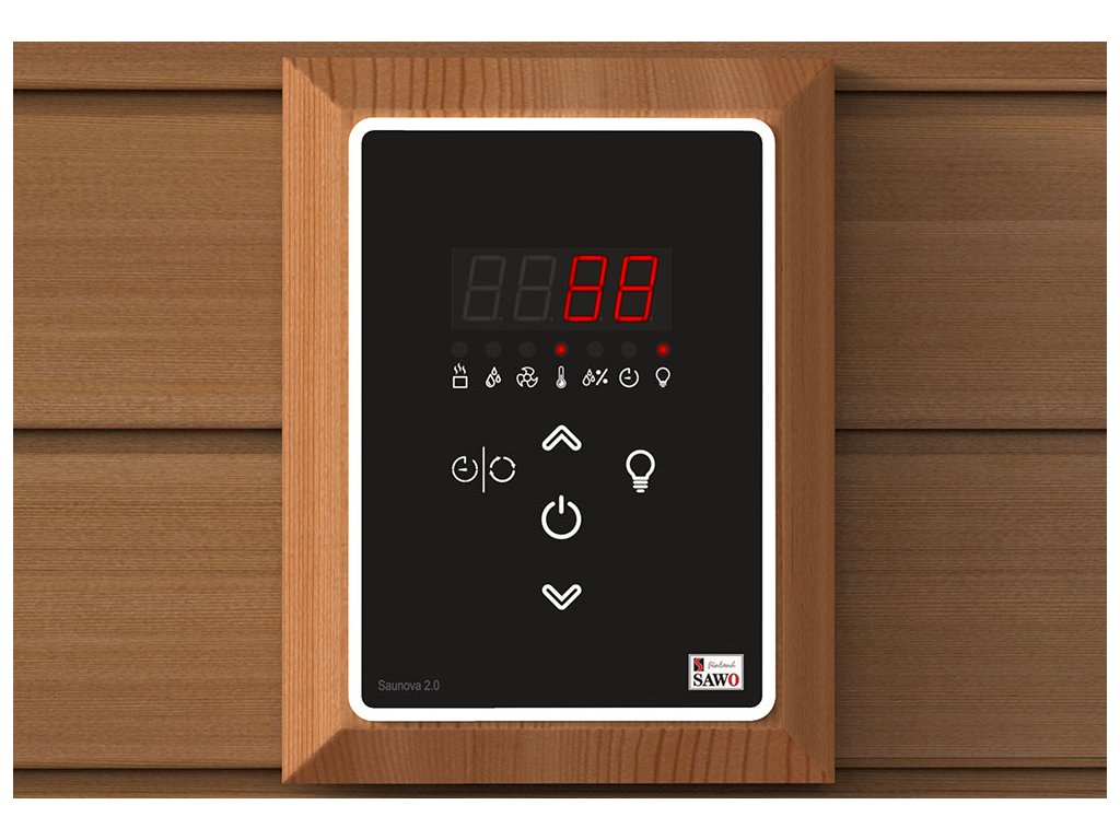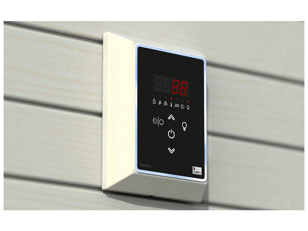 Kontrolní jednotka Saunova 2.0 pro malá saunová kamna do 9 kW. Ovládání lze umístit přímo v sauně nebo i zvenčí.