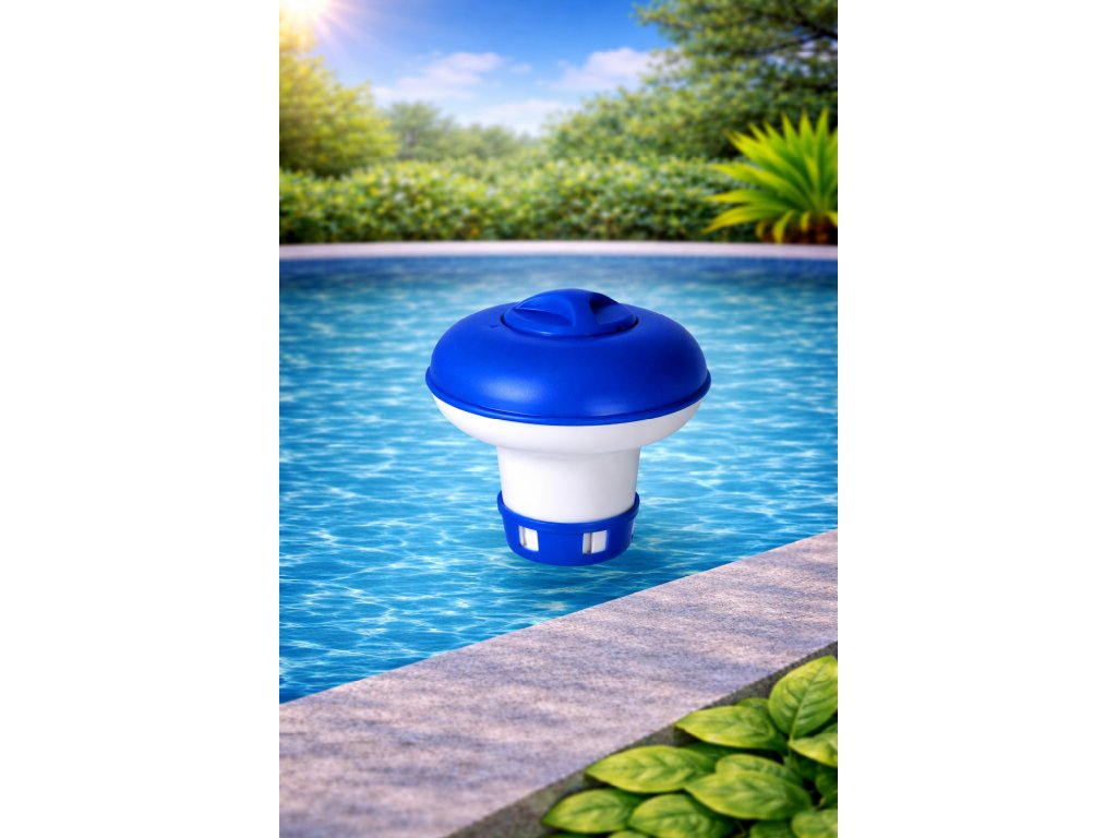 Plovák se používá pro dávkování chlorových tablet, které se uvnitř pomalu rozpouštějí a postupně uvolňují dezinfekční látky do vody. Díky plovoucí konstrukci se plovák pohybuje po hladině a zajišťuje rovnoměrné rozložení chemie v bazénu.
