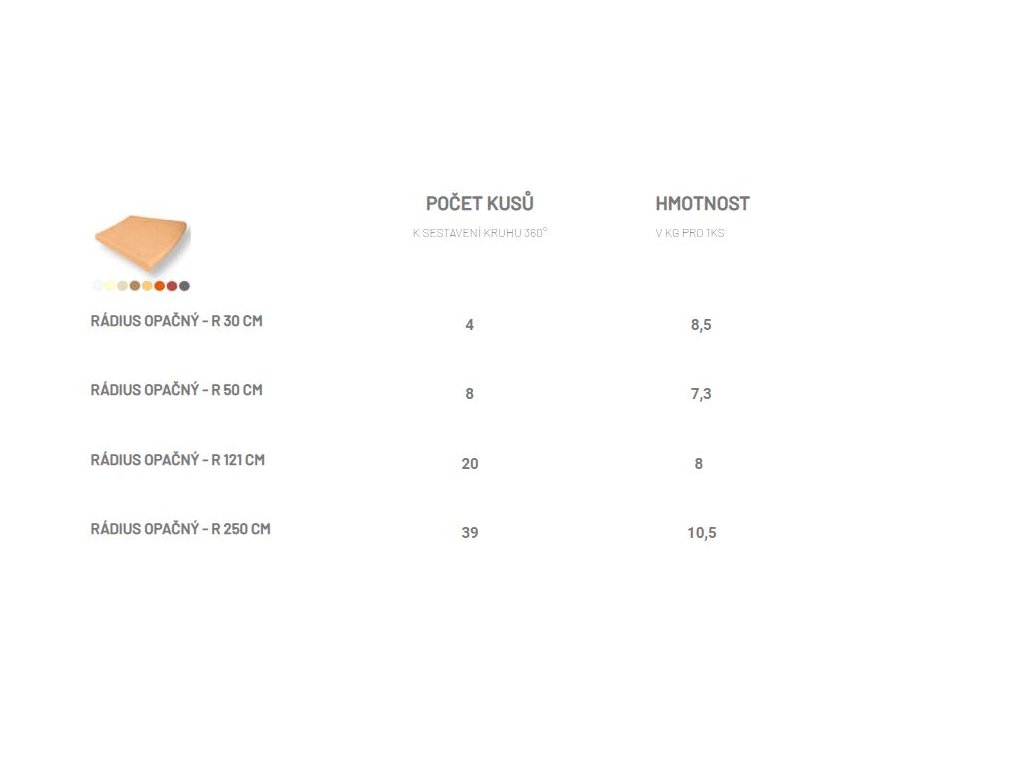 Rádius vnitřní R30 cm, R50 cm, R60 cm, R68 cm, R100 cm, R125 cm, R135 cm, R150 cm, R165 cm, R175 cm, R200 cm, R213 cm, R250 cm, R400 cm, R550 cm, R1000 cm,