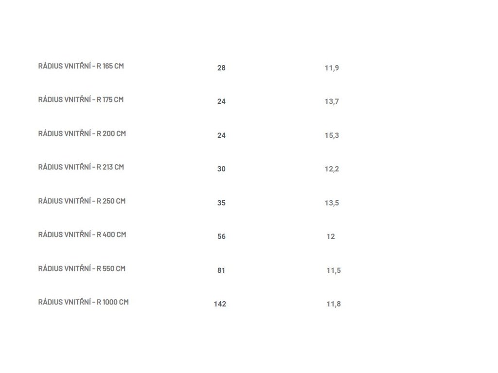 Rádius vnější (opačný) R30 cm, R50 cm, R121 cm, R250 cm