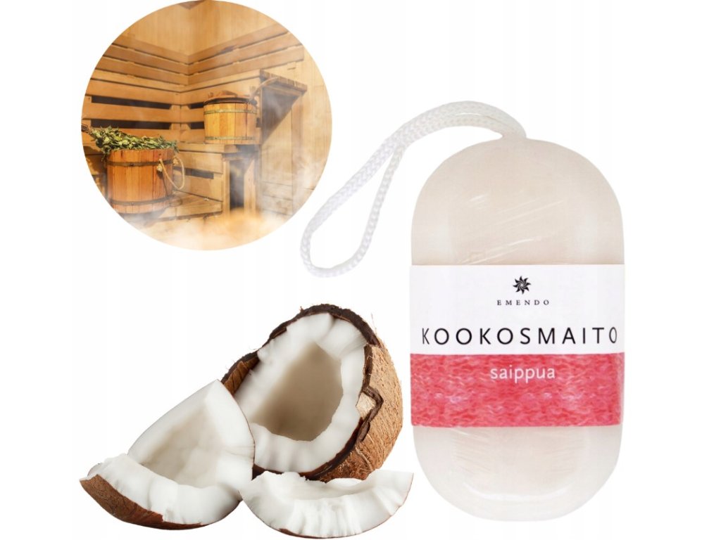 Mýdlo Emendo s kokosovou vůní dělá každý okamžik v sauně uvolňující a příjemnou. Díky obsahu přírodního kokosového mléka hydratuje pokožku a stará se o její regeneraci. Mýdlo zavěšené na praktickém provázku je vždy po ruce, což usnadňuje používání během saunování. Ideální pro masáž a mytí těla, zdůrazňuje komfort a pohodlí.