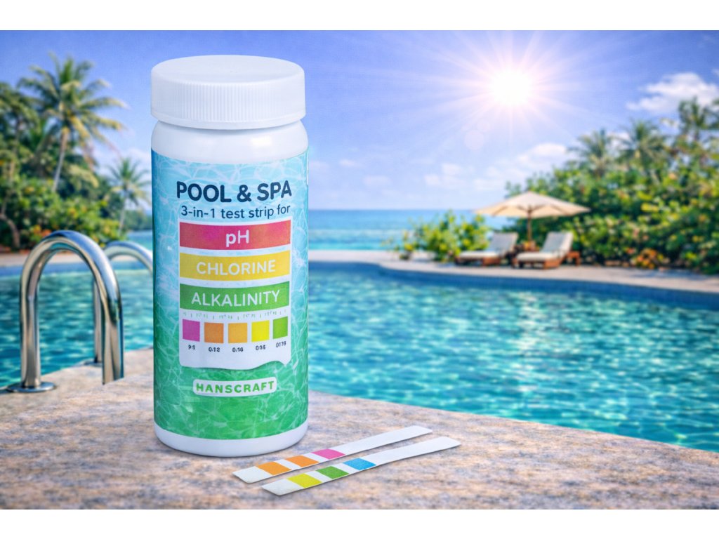 Testovací proužky pH / Chlor / Alkalita od Hanscraft jsou praktické a rychlé diagnostické proužky, které umožňují současné měření tří klíčových parametrů bazénové vody – hodnoty pH, obsahu volného chloru a celkové alkalinity. Tento jednoduchý systém měření poskytuje okamžité výsledky bez použití kapek, reagencií či přístrojů.
