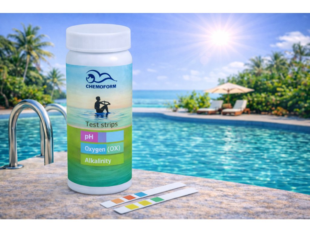 Testovací proužky pH / Kyslík / Alkalita jsou kvalitní diagnostické proužky určené pro rychlé a jednoduché měření tří klíčových parametrů bazénové vody – hodnoty pH, obsahu aktivního kyslíku (OX) a celkové alkalinity.