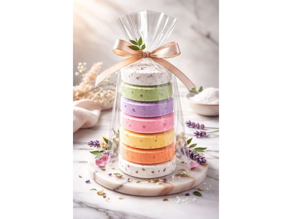 Po kontaktu s vodou se tableta začne pozvolna rozpouštět a uvolňovat aromaterapeutické esence, které naplní sprchový kout jemnou, harmonizující vůní.